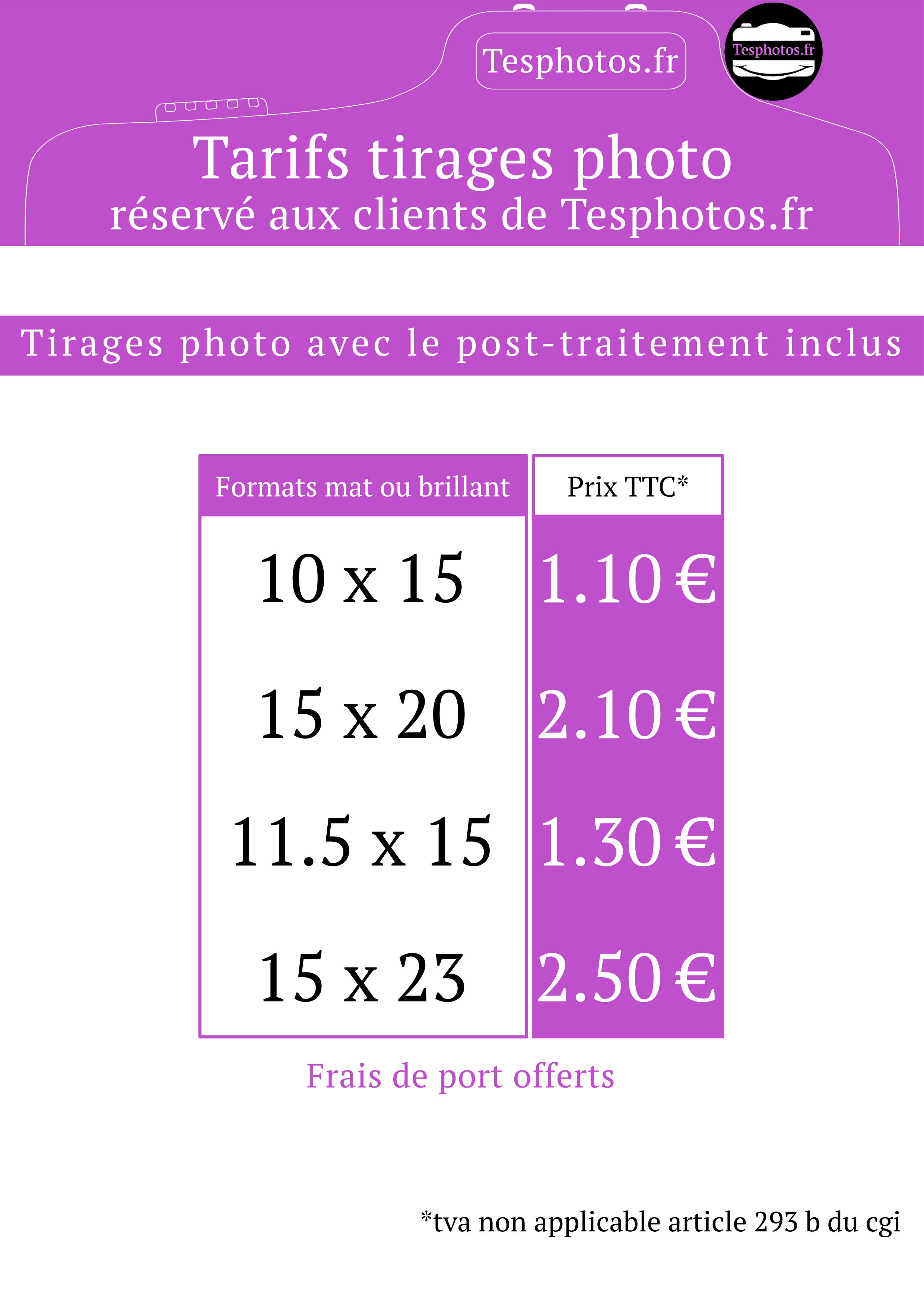Tarifs tirages photo, réservé aux clients de Tesphotos.fr :